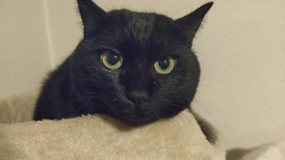 キャットタワーのてっぺんから、まん丸で大きな瞳でロックオンのもみじ。まるで「何かいいことあった?」と語りかけているよう。